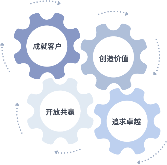 成就客户是一切决策的出发点,,,,创造价值是衡量所有工作的标准,,,,追求卓越是我们做事做人的态度,,开放共赢是我们的格局也是最终的结果。。价值观的齿轮环环相扣,,,推动着组织里的每个人不断向前。。