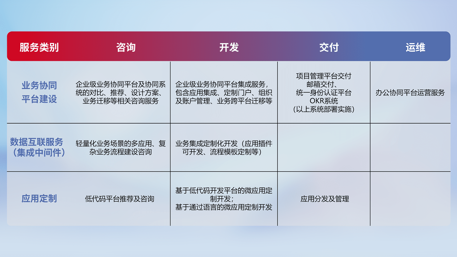 针对钉钉、、企微、、、、IDaas等平台级产品提供产品的规划、、方案、、交付、、、、定制化开发等服务,,,实现如统一协同办公、、智能客户服务、、、、混合会议管理、、、智能数据查询、、等业务场景,,,实现数字化转型。。